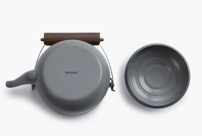 Een theepot die zowel in de buitenkeuken als binnen in de keuken en top uitziet! Ideaal voor het snel verwarmen van water voor de koffie, thee, warme chocolademelk en meer. De theepot heeft een met de hand afgewerkte, roestvrijstalen rand die een koperachtige patina-afwerking creëert en die past bij de volledige emaille-lijn van Barebones.