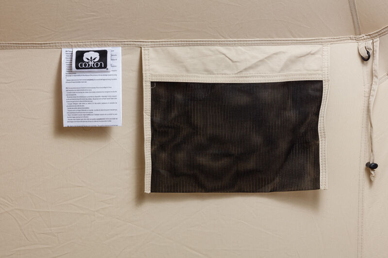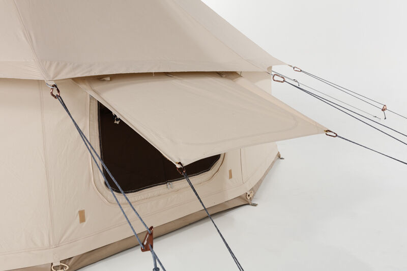 De grote voordeur die hoger, breder en ruimer is dan een standaard Sibley Bell tent, kan ook ingezet worden als voorluifel met aan elke kant een groot raam. Panoramisch zicht!