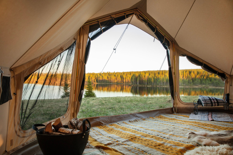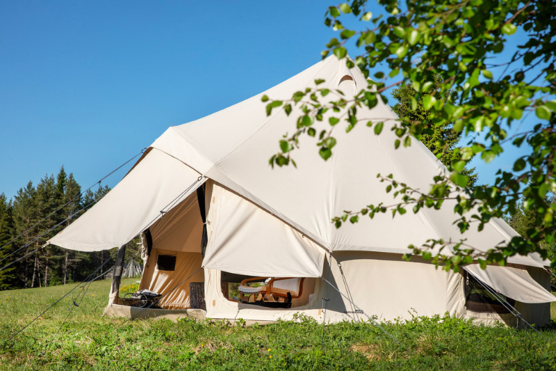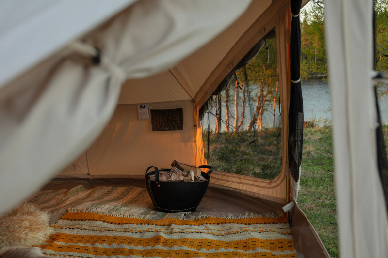 De grote voordeur die hoger, breder en ruimer is dan een standaard Sibley Bell tent, kan ook ingezet worden als voorluifel met aan elke kant een groot raam. Panoramisch zicht!